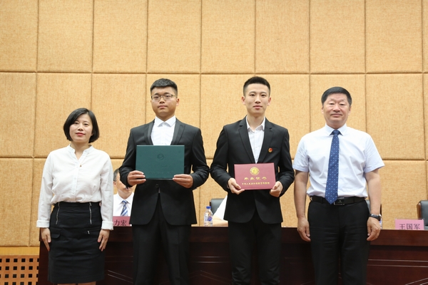 (王国军副院长、徐焕文书记为2019届毕业生代表姜文强、窦如浩同学颁发毕业证书及学士学位证书)