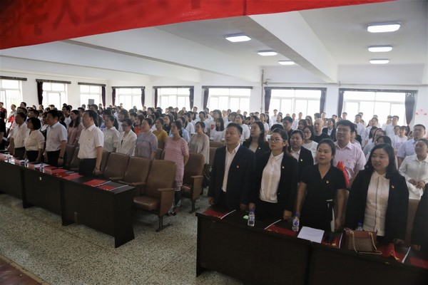 6月28日下午,学校庆祝中国共产党成立98周年暨总结表彰大会在二教六楼报告厅隆重召开。学校领导王国军、徐焕文、张力宏、徐春喜出席大会;全体教师党员、学生党员代表、大学生“学习筑梦班”部分学员等300余人参加大会。表彰大会由副院长徐春喜主持。伴随着庄严的国歌,表彰大会拉开帷幕。