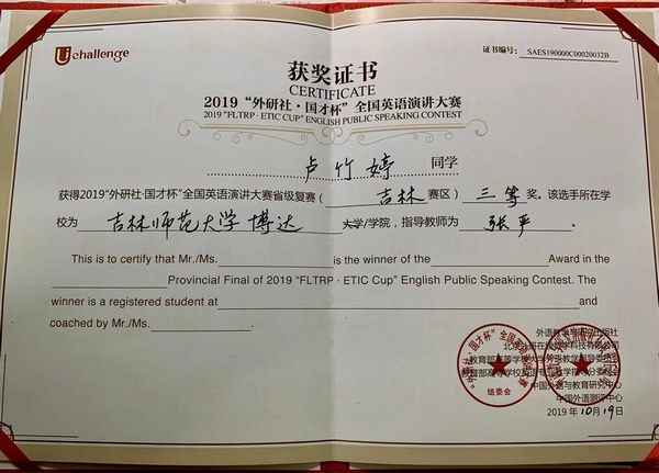 10月19日,由吉林省大学外语教育研究会等单位主办的2019“外研社杯”全国英语演讲大赛吉林赛区复赛在东北师范大学人文学院落下帷幕。我校文学院2017级学生卢竹婷(指导教师张严),获得省赛三等奖。